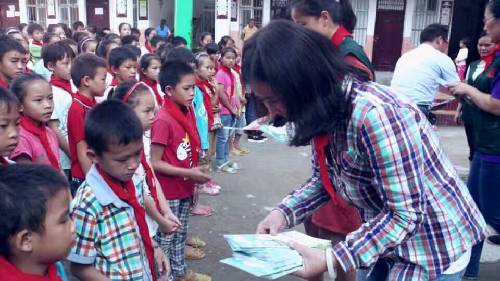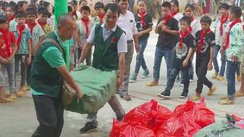 早晨7點鐘,愛心隊伍從南寧地王大廈出發(fā),途中路況極差,塵土飛舞。車隊歷經(jīng)九個小時到達(dá)泮水鄉(xiāng)村冊外小學(xué)。愛心團(tuán)隊的到來,頓時令這個校園學(xué)生歡騰熱鬧起來,學(xué)生排好整齊的隊伍歡迎著愛心隊伍的到來。學(xué)生代表們給到場的每一位愛心人士戴上了感恩紅巾。
