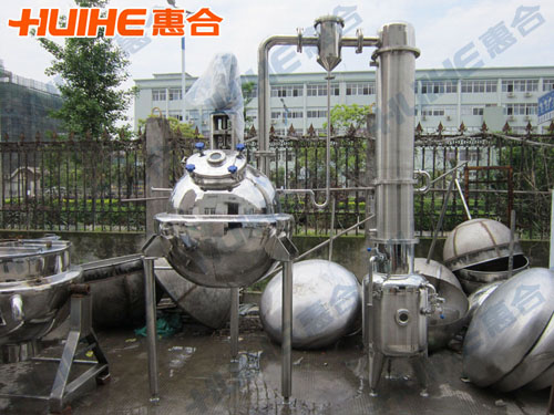 將球形濃縮器的真空口和進(jìn)料口閥門打開,將液料抽入罐內(nèi),罐內(nèi)液面達(dá)到一定高度后,關(guān)閉進(jìn)料閥,并緩緩開放蒸汽進(jìn)口閥門,將罐內(nèi)液體的沸騰數(shù)分鐘后,注意保持該時(shí)的蒸汽壓力和真空程序(亦可通過溫度控制,使沸騰正常進(jìn)行)。蒸餾液體通過分離器,其中部分回流至主體罐內(nèi)。不凝部分通過冷凝器冷凝成液進(jìn)入受料桶,進(jìn)行加收或排放,濃縮結(jié)束后,關(guān)閉真空口,蒸汽口閥門,打開放空口(即直嘴式旋塞閥)常壓后出料。